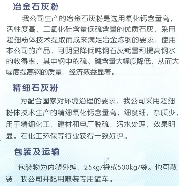 生产的氢氧化钙、氧化钙、重质碳酸钙、灰钙粉,主要用于电力行业脱硫、污水处理、冶金、皮革、涂料、造纸化工等行业